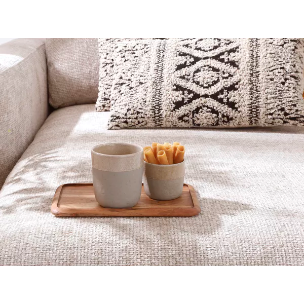 Deze serviescollectie speelt met organische, perfect imperfecte vormen. Ze is ook bijzonder in de manier waarop ze de ruwe textuur van de keramiek aan de buitenkant laat zien, en een glanzend reactief glazuur aan de binnenkant. Zo zien je gerechten er mooi uit, en blijft het servies ook gemakkelijk om af te wassen. De bekers hebben een rand van reactief glazuur aan de buitenrand om het contact met de mond aangenamer te maken.