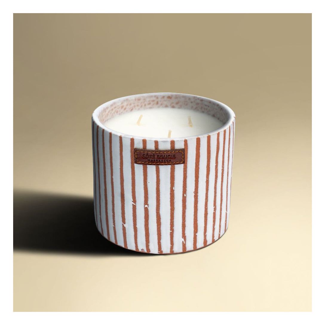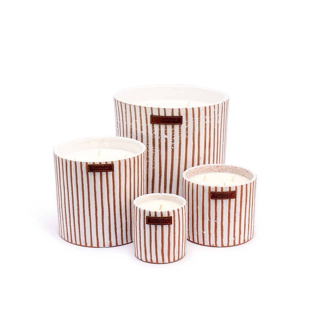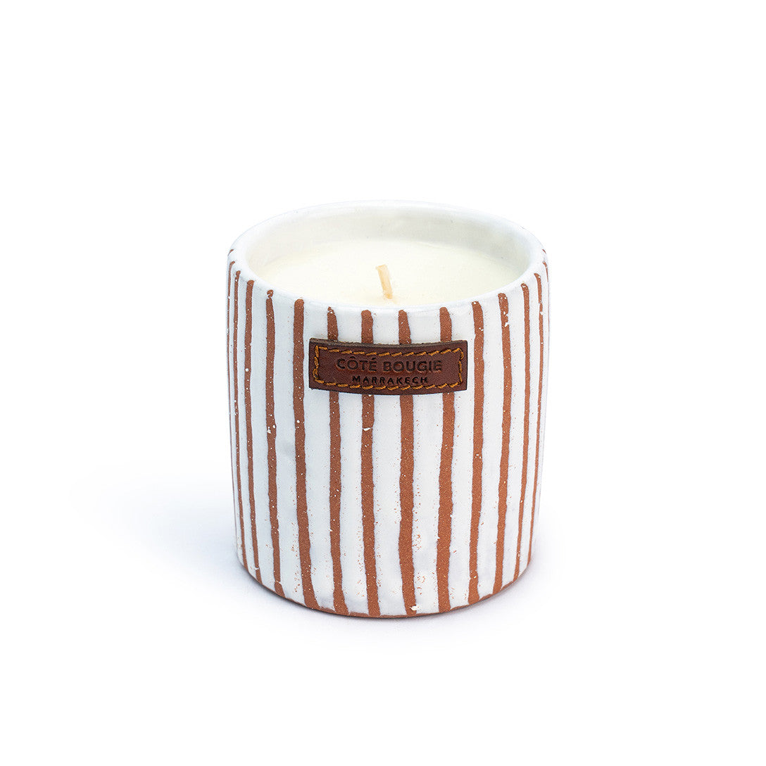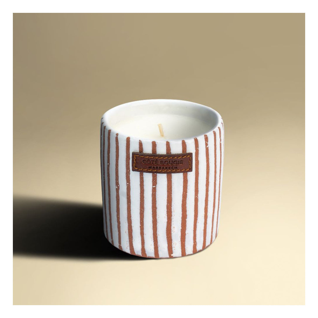 Dit nieuw ontwerp werd gemaakt met lef. Een witte keramische pot met terracottakleurige zebrastreepjes. De geuren zelf worden gemaakt in het bekende Grasse, de parfumhoofdstad wereldwijd.